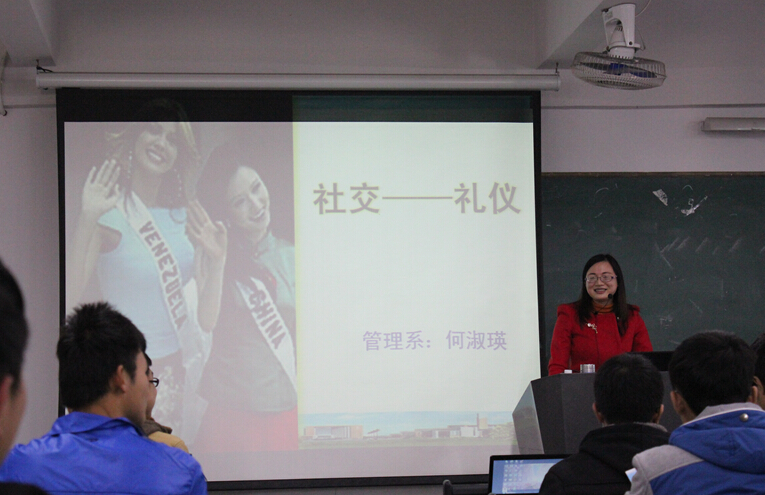 2014 何老师通过讲解和现场亲身示范,让大家更加清晰地了解“礼仪”、“仪表着装礼仪”、“仪态礼仪”、“其他礼仪”的内涵和注意事项。 现场请同学上台演示,加深大家对礼仪的理解。
