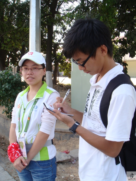 “青年志愿服务发展”采访与探究 导读: 1.志愿者采访经历 2.分析与总结 3.外部材料借鉴 4.团队 一.志愿者采访经历: 时间:2010.11.14 地点:广州市白云区大罗村交通灯处 采访人(以下简称Q):黎仕立,邓小飞,苏婵 采访对象(以下简称A):广州亚运会城市志愿者(广州科技职业技术学院学生) Q:你们现在工作多少人轮一岗?有休息吗? A:我们现在4人1岗,休息是我们分站内部轮休。 Q:你觉得志愿者后勤如何? A:对志愿者后勤比较满意,饭菜我觉得比学校要好(这天菜有:鸡腿、土豆丝炒猪肉,青瓜炒肉丸,一个青菜,价格:免费) (现场的交通红绿灯停止工作) Q:这里是有很多大货车经过,加上刚刚没了红绿灯,车速这么快,你们不害怕吗...
