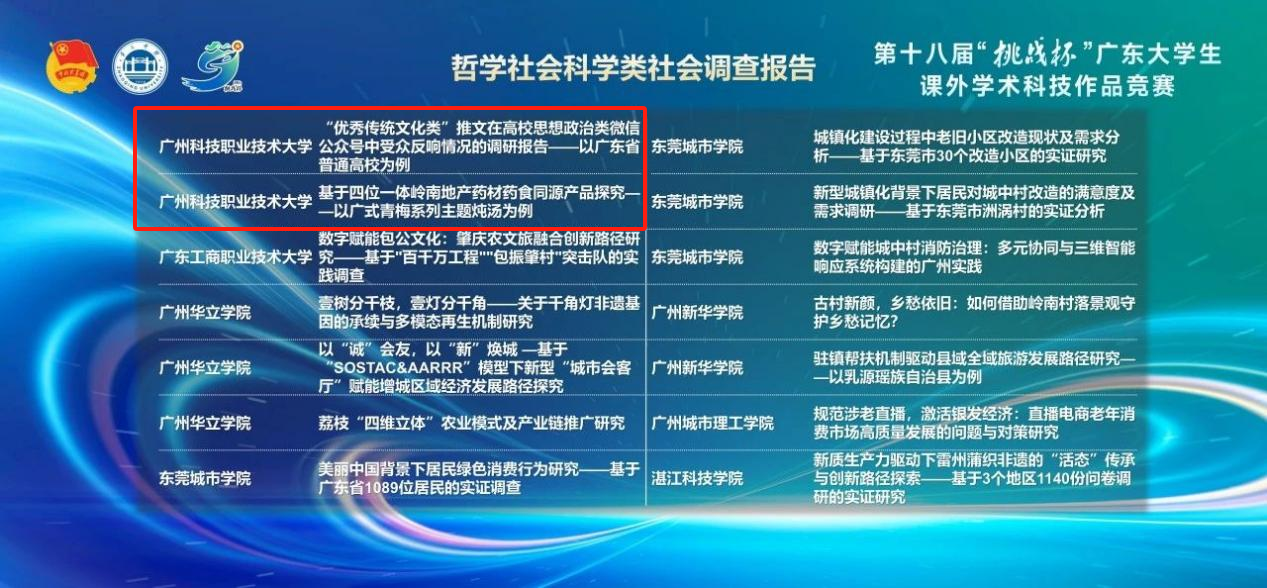 (广科大新闻网讯)近日,第十八届“挑战杯”广东大学生课外学术科技作品竞赛终审决赛在肇庆学院举行。在本次赛事中,我校参赛团队表现突出,共获得主体赛一等奖1项、二等奖2项、三等奖8项;同时在“挑战杯”广东大学生课外学术科技作品竞赛肇庆“百千万工程”专项赛中获得三等奖1项。
