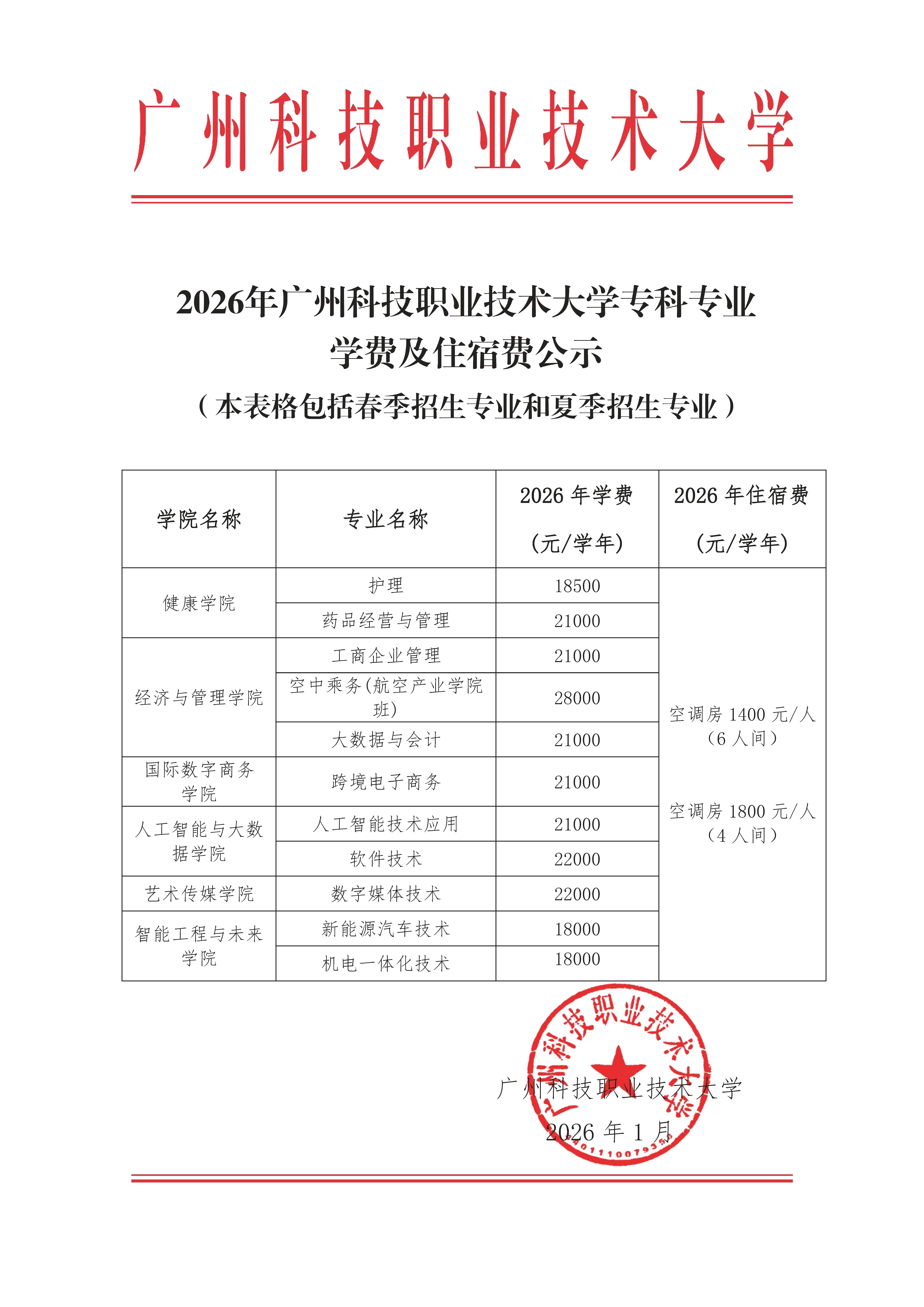 2026年广州科技职业技术大学专科专业学费及住宿费公示