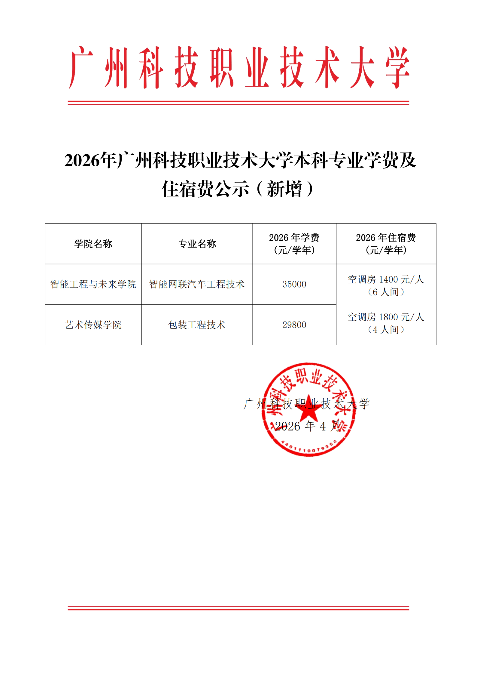 2026年广州科技职业技术大学本科专业学费及住宿费公示(新增)