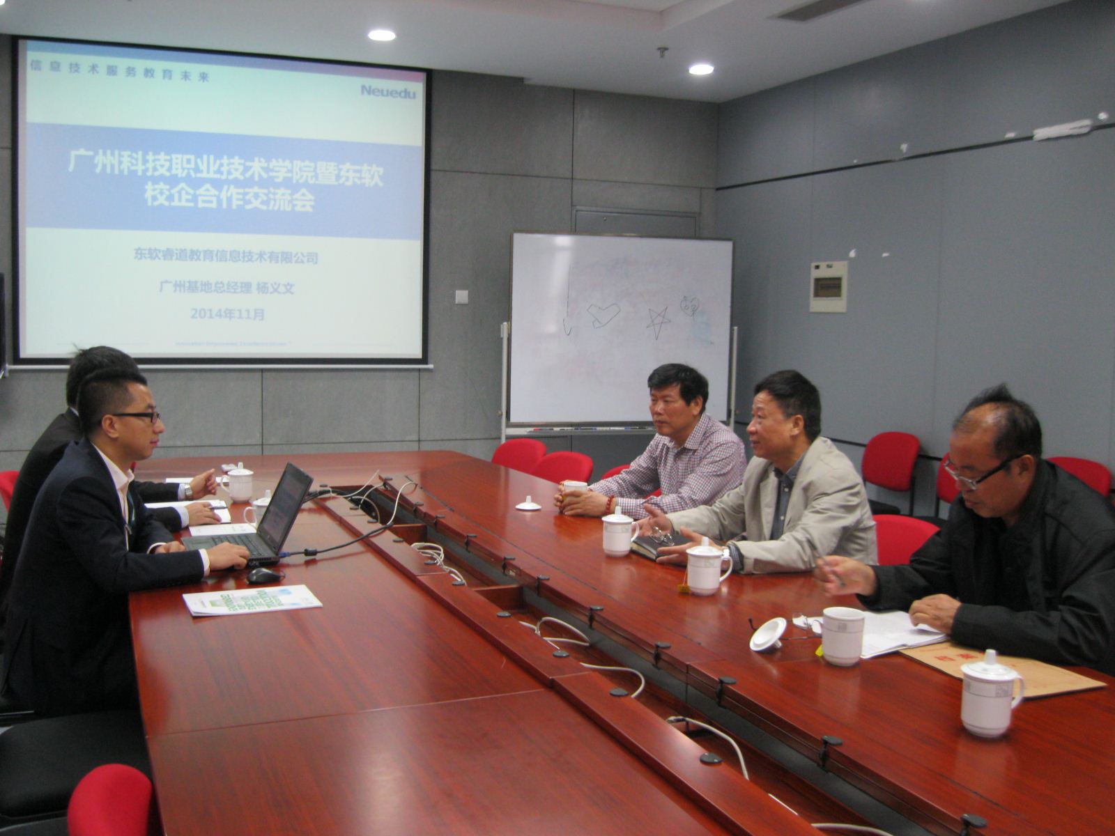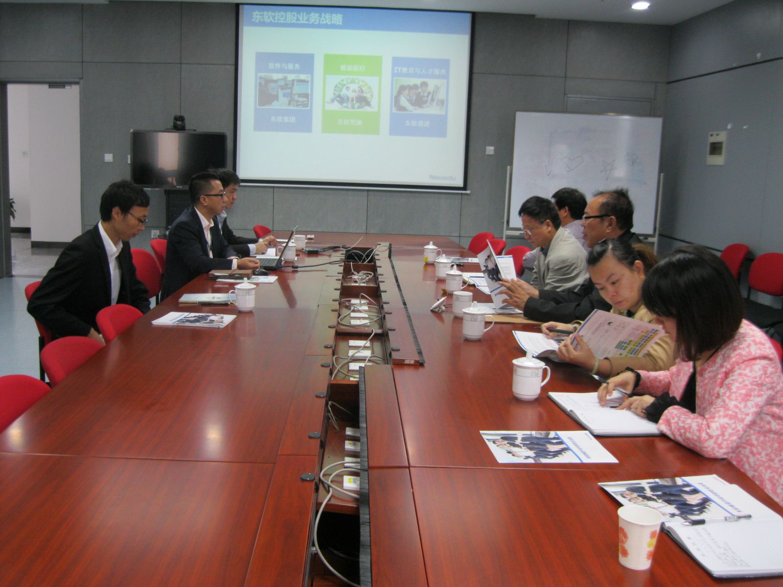 在洽谈过程中,首先,杨总围绕东软集团的业务介绍、公司的行业解决方案惠及民生、产品工程解决方案与服务、软件产品与平台、东软睿道公司概况、东软睿道发展历程、公司实训基地概况、公司业务架构、核心的人才培养模式、方法实训学、人才培养框架、课程体系、训练体系、企业化教学管理体系、质量管理与考核体系、学员管理体系、人才培养优势、就业推荐机制以及校企联合培养案例等内容进行详细介绍。
