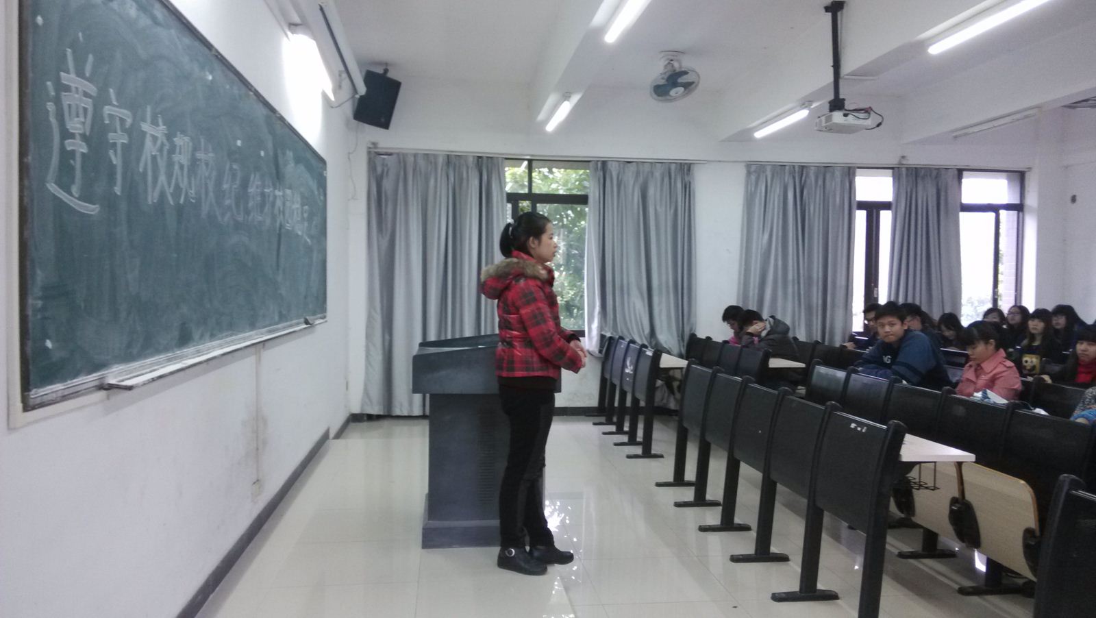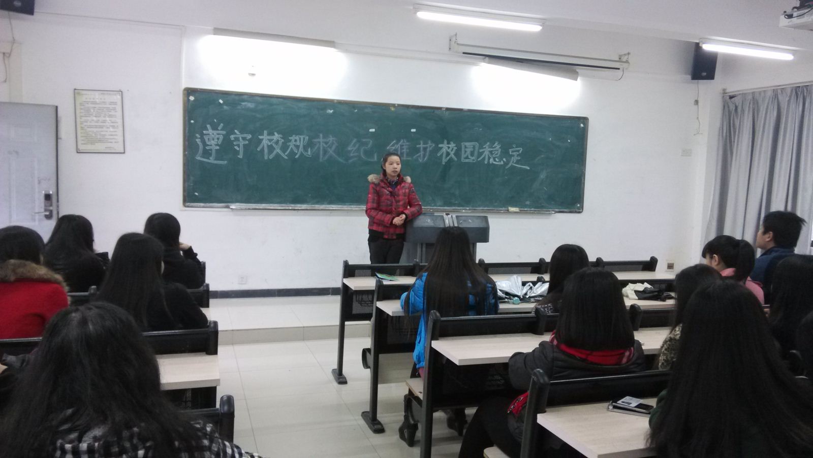 本系讯:12月3号下午我系举行遵守校规校纪维护校园稳定主题教育活动,党支部书记邱健,辅导员符婷婷,刘惠芳以及13,14级学生参加活动。