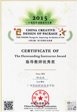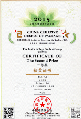 我系学生在本次大赛获得二等奖3名;获得三等奖2名;获得入围奖9名。尚华主任被授予“领衔专家证书”;肖宇霖老师被授予“专家证书”;钟金琦老师荣获“优秀指导教师”称号。我院“广州科技职业技术学院”被授予“2015’中国包装创意设计大赛参与评审院校称号。尚华主任作为12位全国知名院校的学科代表人之一,为奖项的最终评审确定做了大量的工作,为我院夺得了优秀评审单位奖的荣誉,世界包装组织副主席卡尔·奥斯迈茨为尚华主任和其他11位获奖代表颁奖。