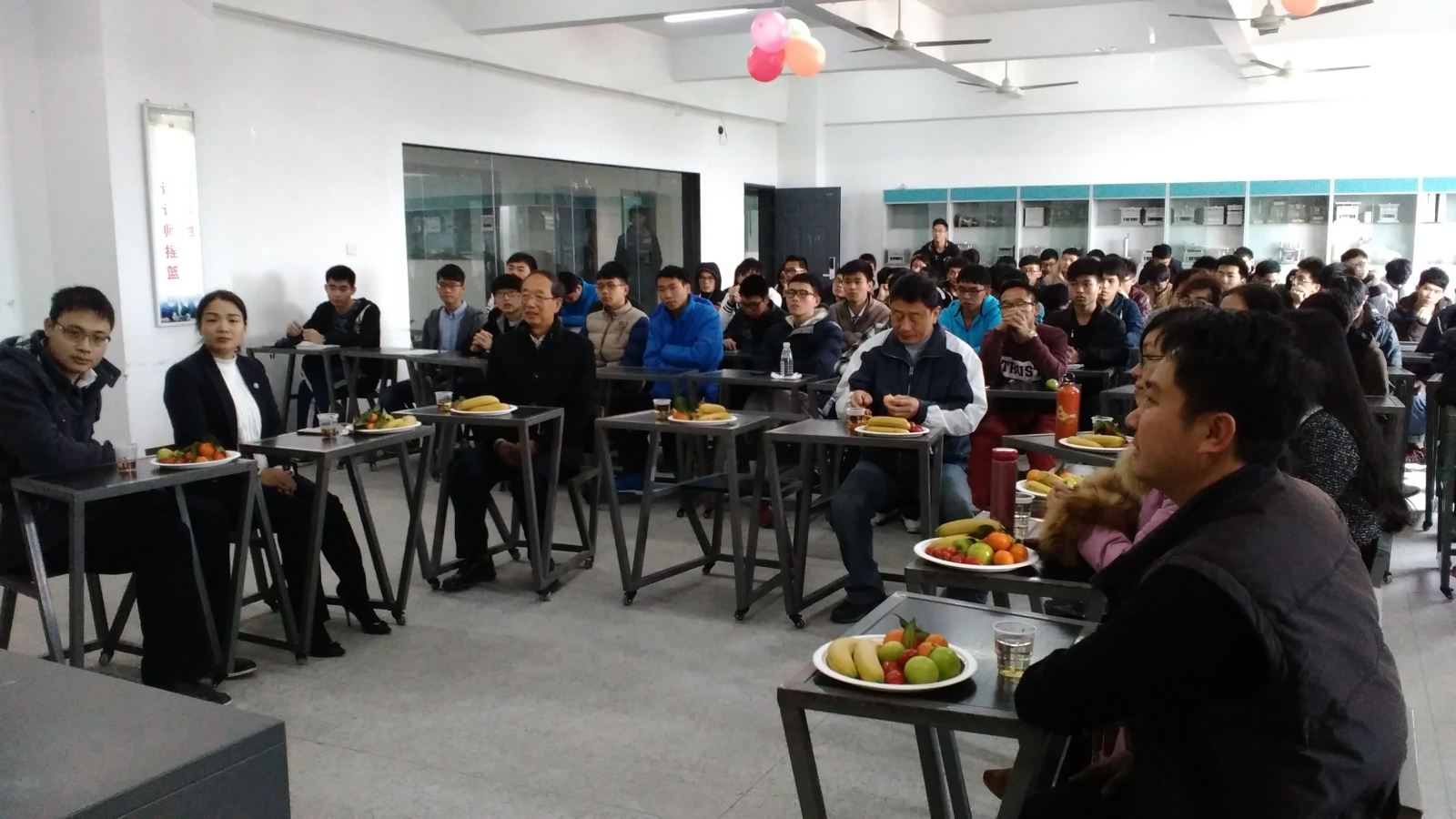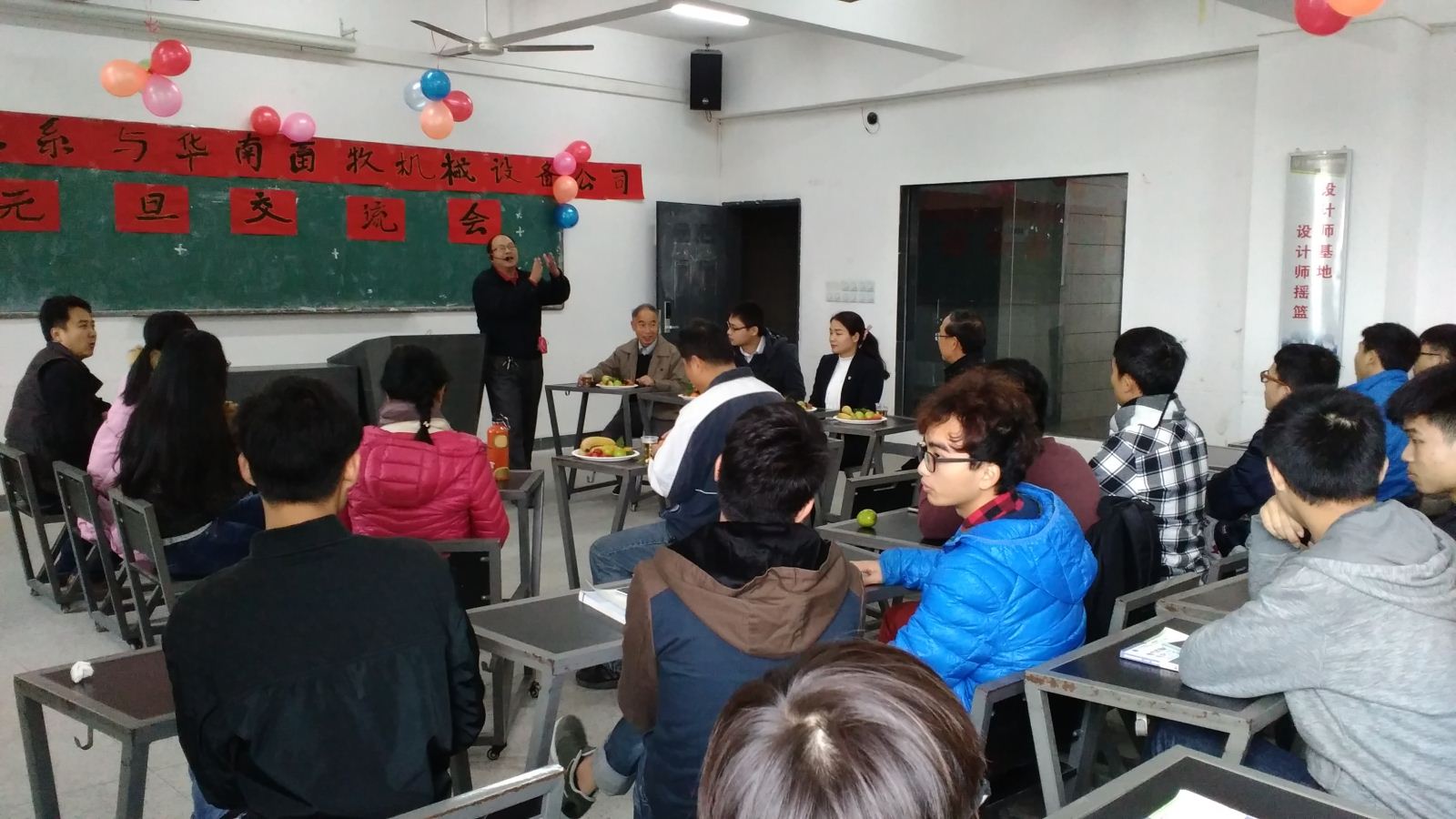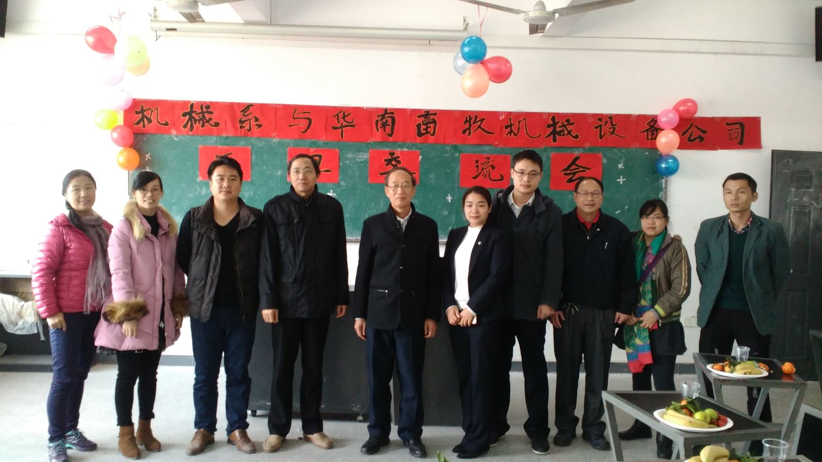 ,机械系与华南畜牧设备有限公司开展元旦交流会,参与会议的人有华南厂人事部经理张丽敏、技术部经理张经理,我系李昌权主任、高立义主任、邓汝荣等老师,及我系2014级学生,包括模具设计与制造、机电一体化、数控技术各个专业。2015年9月起,我系与华南畜牧设备有限公司正式开始深度校企合作与交流,此次会议前,我系已与该厂进行了篮球友谊赛。