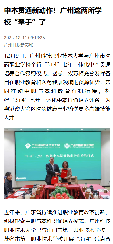 12月9日,广州科技职业技术大学与广州市医药职业学校举行“3+4”七年一体化中本贯通培养合作签约仪式。据悉,双方将充分发挥各自在职业教育和医药健康领域的资源优势,共同推动中职与本科教育有机衔接,构建“3+4”七年一体化中本贯通培养体系,为粤港澳大湾区医药健康产业输送更多高端技能人才。